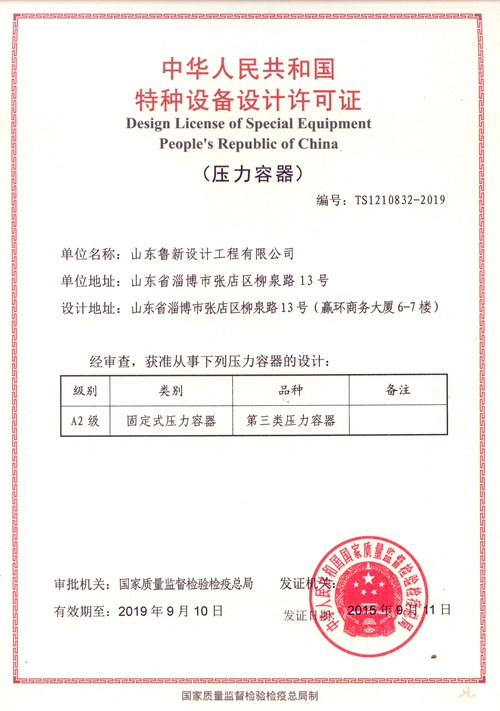 近日,根據《壓力容器壓力管道設計許可規則》(特種設備安全技術規范TSGR1001-2008),公司申報的A2級(第三類壓力容器)設計資質正式得到了國家質量監督檢驗檢疫總局的批準,批準日期為2015年9月10日。